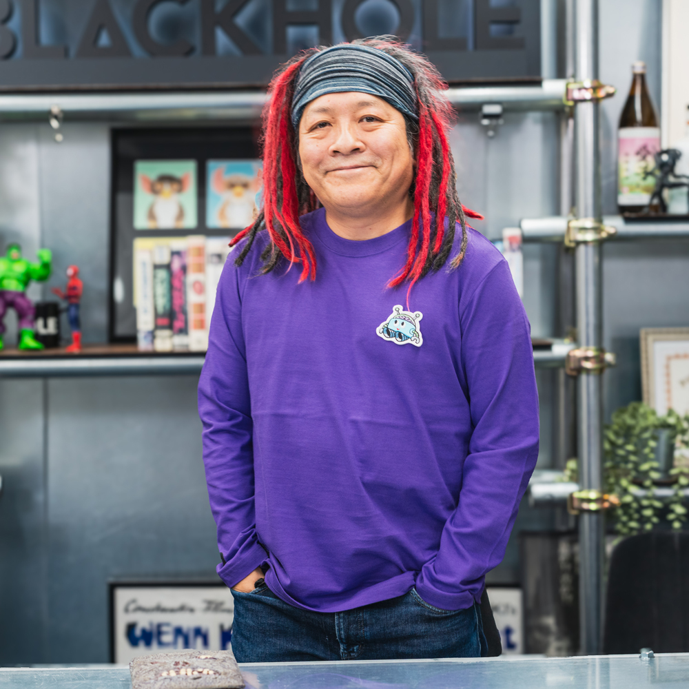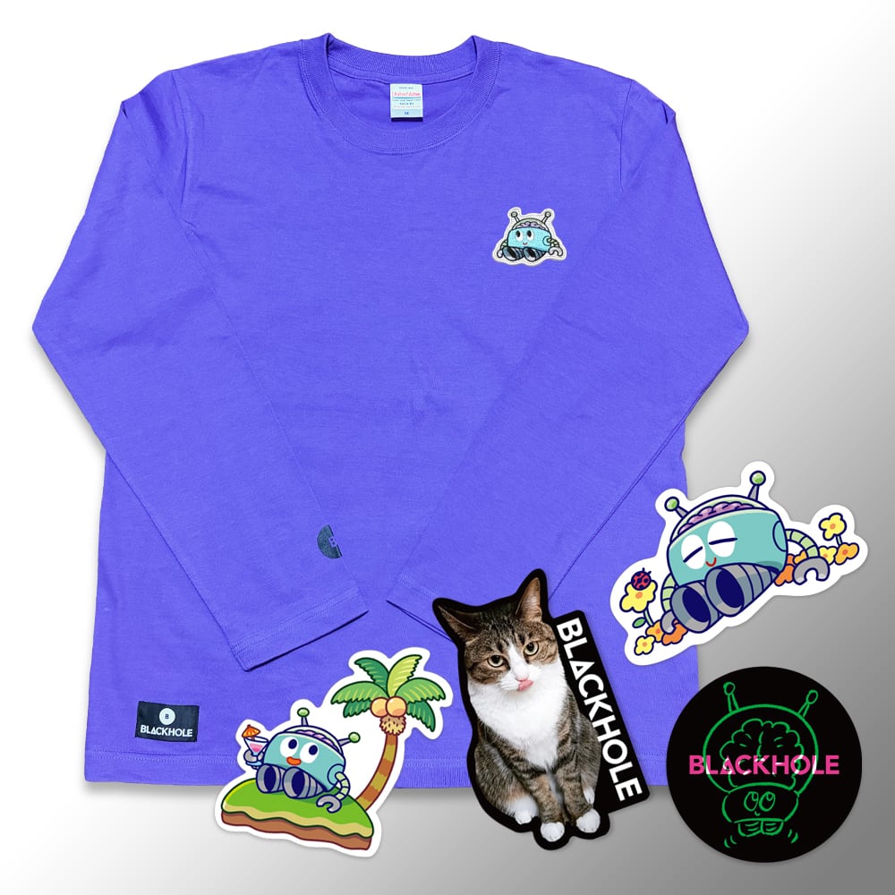 ブラックホールくんの大きめワッペンがついたロングTシャツです。右手の袖口にはBLACKHOLEのマルBロゴがさりげなくプリントされています。