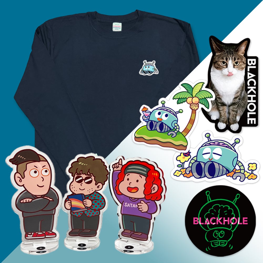BLACKHOLEのいつもの3人のキャラクターがアクスタになったセットです。お家で映画を見る時や、晩酌のおともに。