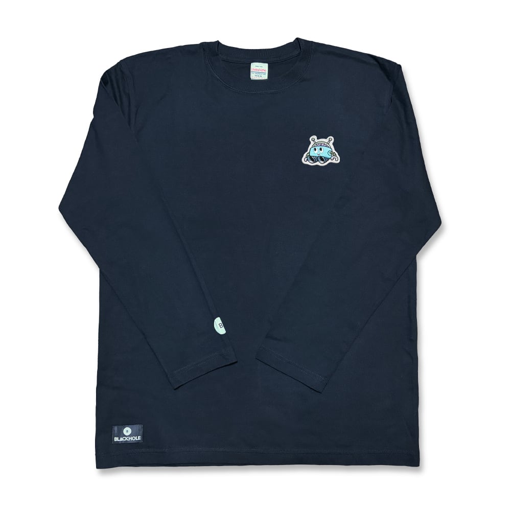 ブラックホールくんの大きめワッペンがついたロングTシャツと、ステッカーセット、アクスタ<BLACKHOLE仲良し3人組セット版> が一緒になった、盛り盛りのお得なセットです。ロンTの右手袖口にはBLACKHOLEのマルBロゴがさりげなくプリントされています。