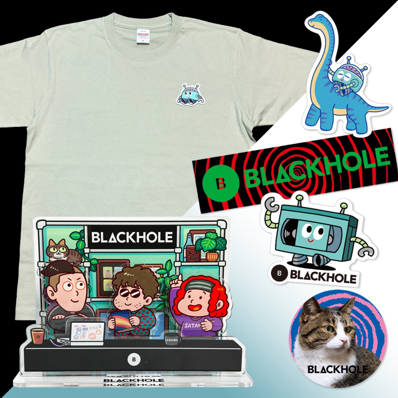 『ブラックホールくん』ワッペンT・セージグリーン+ステッカー+アクスタ<金曜8時はBLACKHOLE完全版>お得セット(販売期間限定)